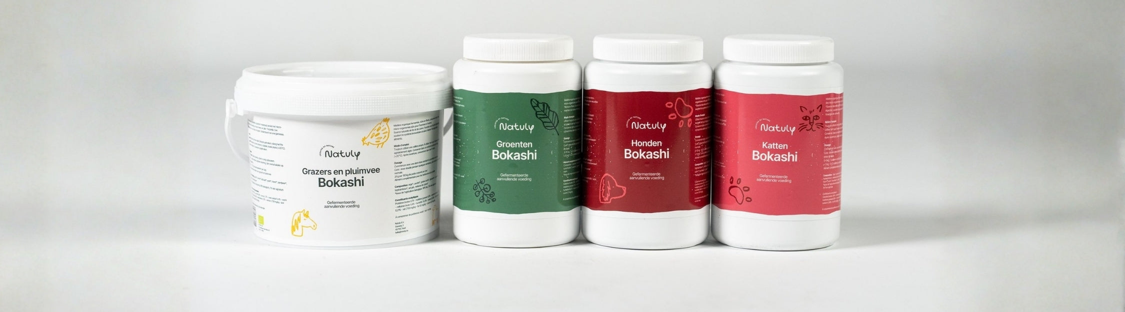 - Gedroogde bokashi – speciaal voor dieren met een gevoelige maag of darmen. Door het droogproces zijn bepaalde micro-organismen tijdelijk inactief geworden en is de werking milder, maar de natuurlijke waarde blijft behouden. Licht, droog en hardere structuur.